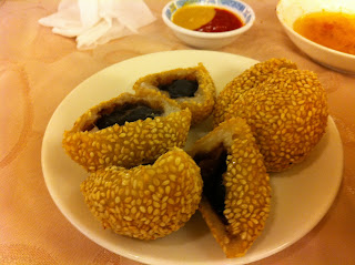 終於到甜點時間了!!!每次來必點的兩道其中一道就是芝麻球了,三顆一盤,他會幫你剪開,芝麻球怎會這樣好吃,熱熱吃超享受,隱藏在這個樸素的外表底下,有點黏又不會太黏,搭配芝麻的香味,真的是甜點中的極品阿!